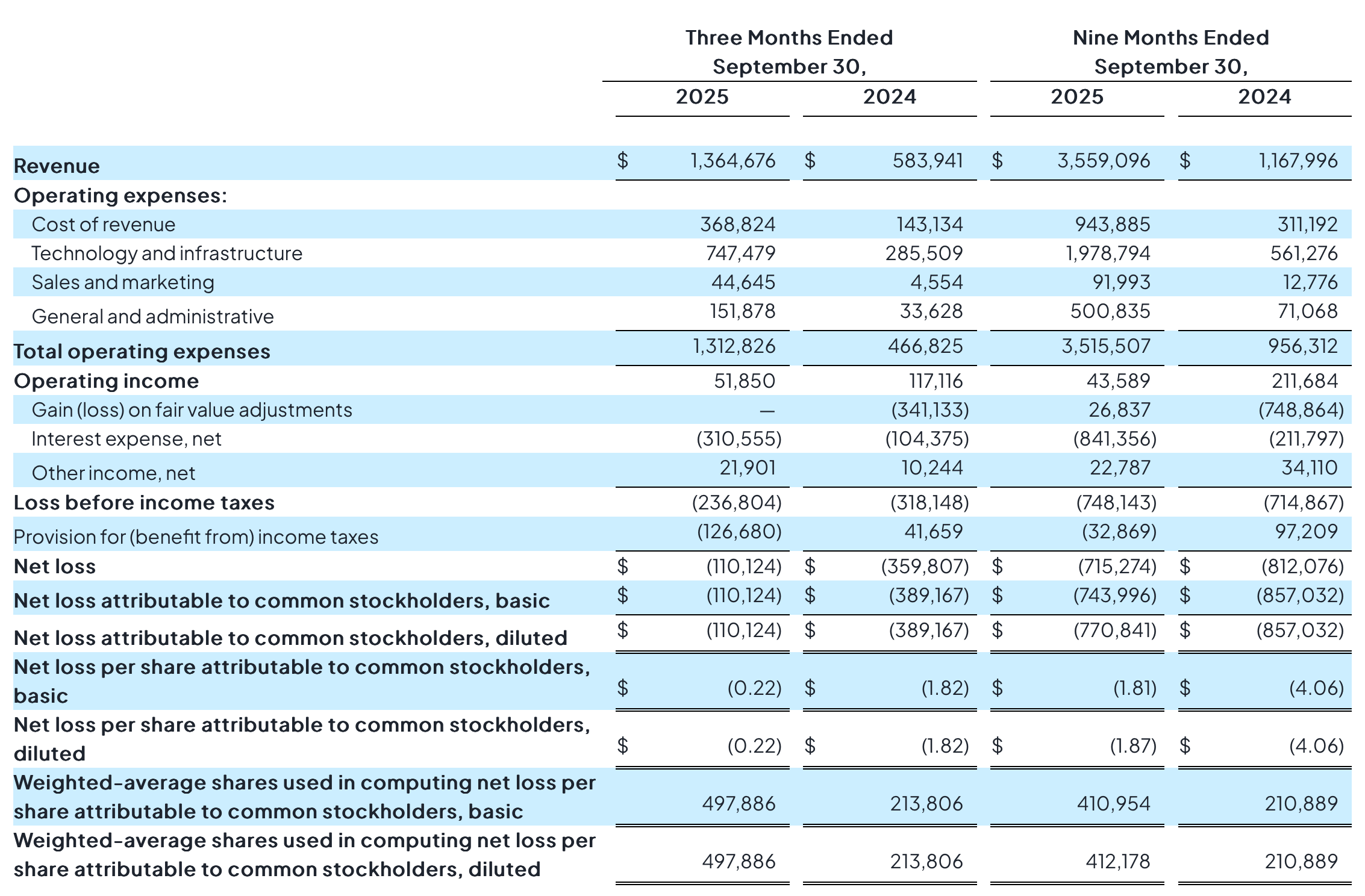 The Q3 results highlight both the growth and the uncertainty of the neocloud model. Revenue for the quarter reached $1.36B, up from $584M a year ago. For the first nine months of 2025, revenue totaled $3.56B compared with $1.17B in the same period of 2024. The company is scaling quickly, but the cost structure remains complex. Cost of revenue was $369M in Q3 and $944M for the year to date. Technology and infrastructure expense was $747M in Q3 and $1.98B for the first nine months. These lines include power, networking, bandwidth, operational labor, and hardware depreciation that is embedded across several categories instead of appearing as a separate line item. As a result, it is difficult to determine the true economic margin of the business from the income statement alone. CoreWeave reported an operating loss of $237M in Q3 and a net loss of $110M, which contributed to a year-to-date net loss of $715M.