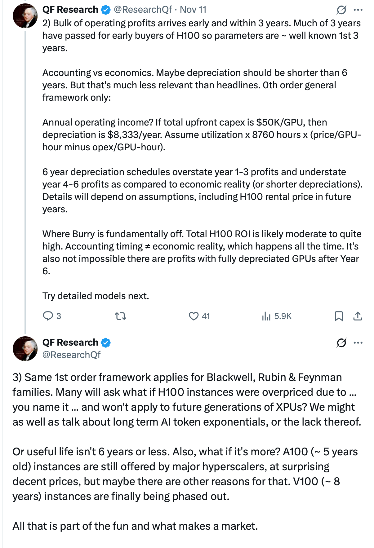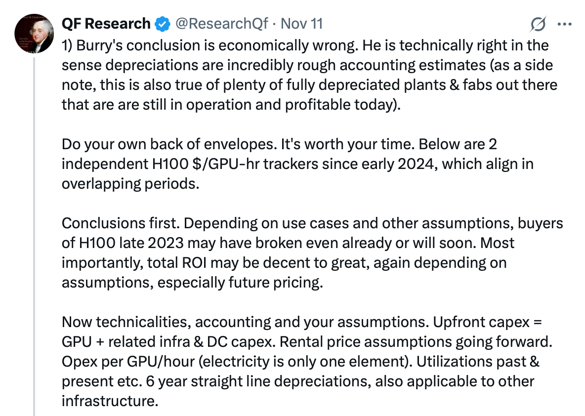 QF Research also had thoughtful tweets about economic reality of H100s, rebutting Burry’s thesis.