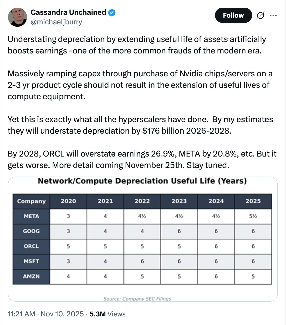 Michael Burry made waves this week with news that his hedge fund has terminated its SEC registration, possibly signaling that he is shutting it down, and for a tweet raising concerns that big tech companies may be understating depreciation expenses on GPUs by assuming longer useful lives for the machines. Burry argued that these changes will lead these companies to overstate earnings by $176B from 2026 through 2028.