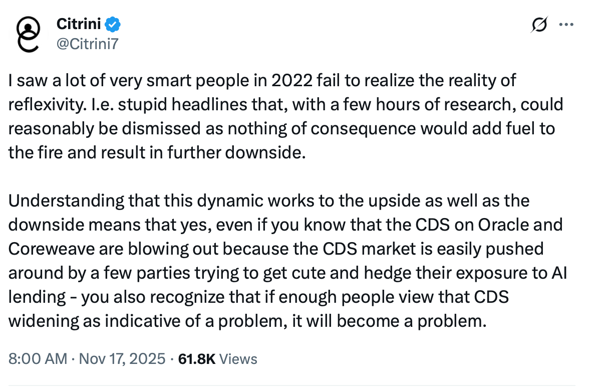 Citrini had a great tweet about reflexivity as it pertains to CDS spreads widening for CoreWeave and Oracle.