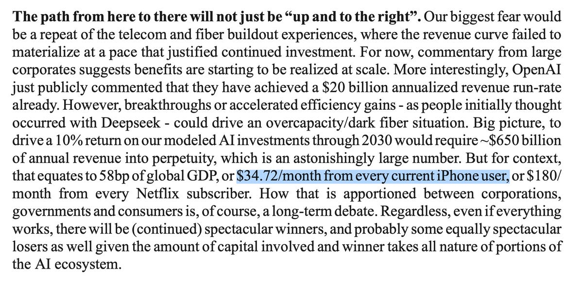 The third question is where value accrues within the stack. At present most value creation sits with the semiconductor supply chain, particularly NVIDIA, TSMC, and the upstream and downstream partners that support them. The hyperscalers capture value next, but only after deploying significant capital and operating large physical footprints. Consumers enjoy a large surplus because products like ChatGPT, Claude, Cursor, and Gemini offer significant capability at relatively low prices. The application layer sits in a more uncertain position. The industry has not yet demonstrated how much of the value will remain with software companies once the cost of infrastructure is considered. At this stage the hyperscalers remain price takers in accelerator supply, and the application layer has not established durable high-margin economics relative to the scale of investment being made beneath it. JP Morgan estimates that to return 10% on AI investments through 2030, there will need to be $650B in revenue in perpetuity, the equivalent of $34.72 per iPhone user.