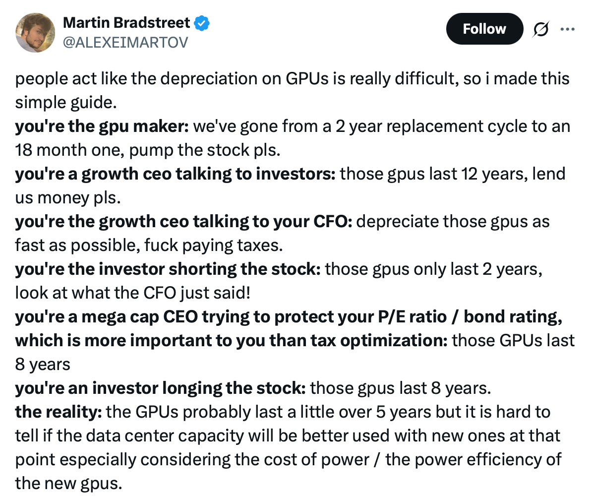 As many people highlighted, another common rebuttal is the fact that A100s are still being rented, 5 years after they were purchased, though the going profitability remains a question. I also enjoyed this tweet about the different incentives that various parties have to depreciate GPUs over different timelines.