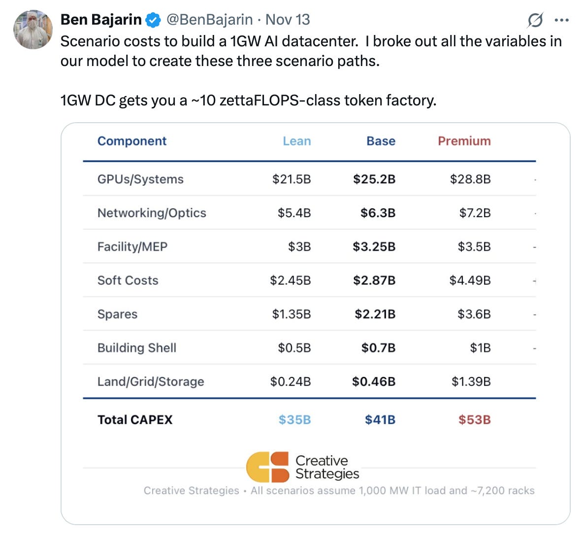 For context, I found this tweet helpful in understanding the costs involved in building a 1 GW AI data center