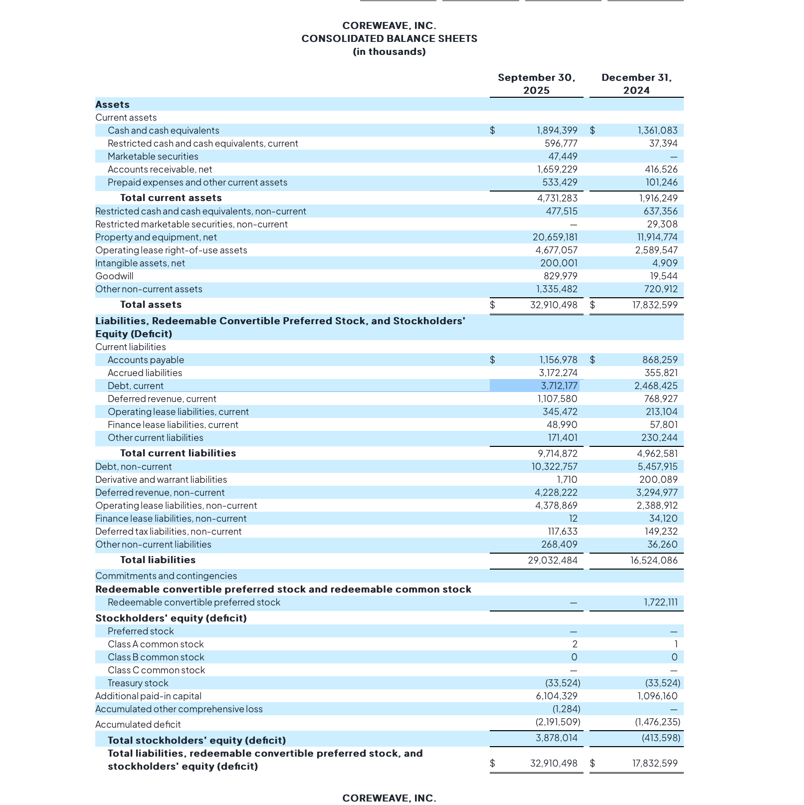 The balance sheet gives a clearer view of the scale of investment. Total assets increased from $17.83B at year-end 2024 to $32.91B at the end of Q3 2025. Property and equipment grew from $11.91B to $20.66B in the same period. The company is adding nearly $9B of hardware and data center assets in only nine months. Total liabilities also expanded to $29.03B, reflecting a growing mix of current and long-term obligations. CoreWeave’s capital structure is therefore highly leveraged, and the long-term return on these invested dollars has not yet been demonstrated.